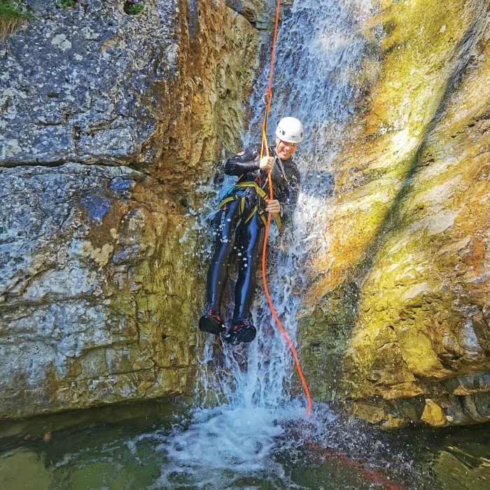 - 55 m waterfall rappel — the spectacular highlight of Predelica